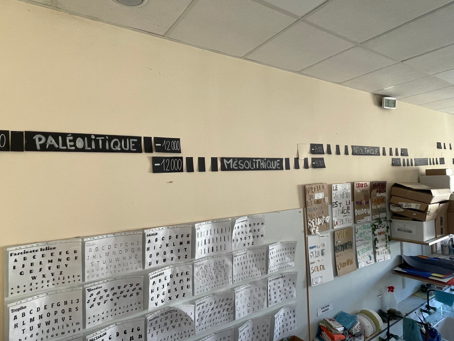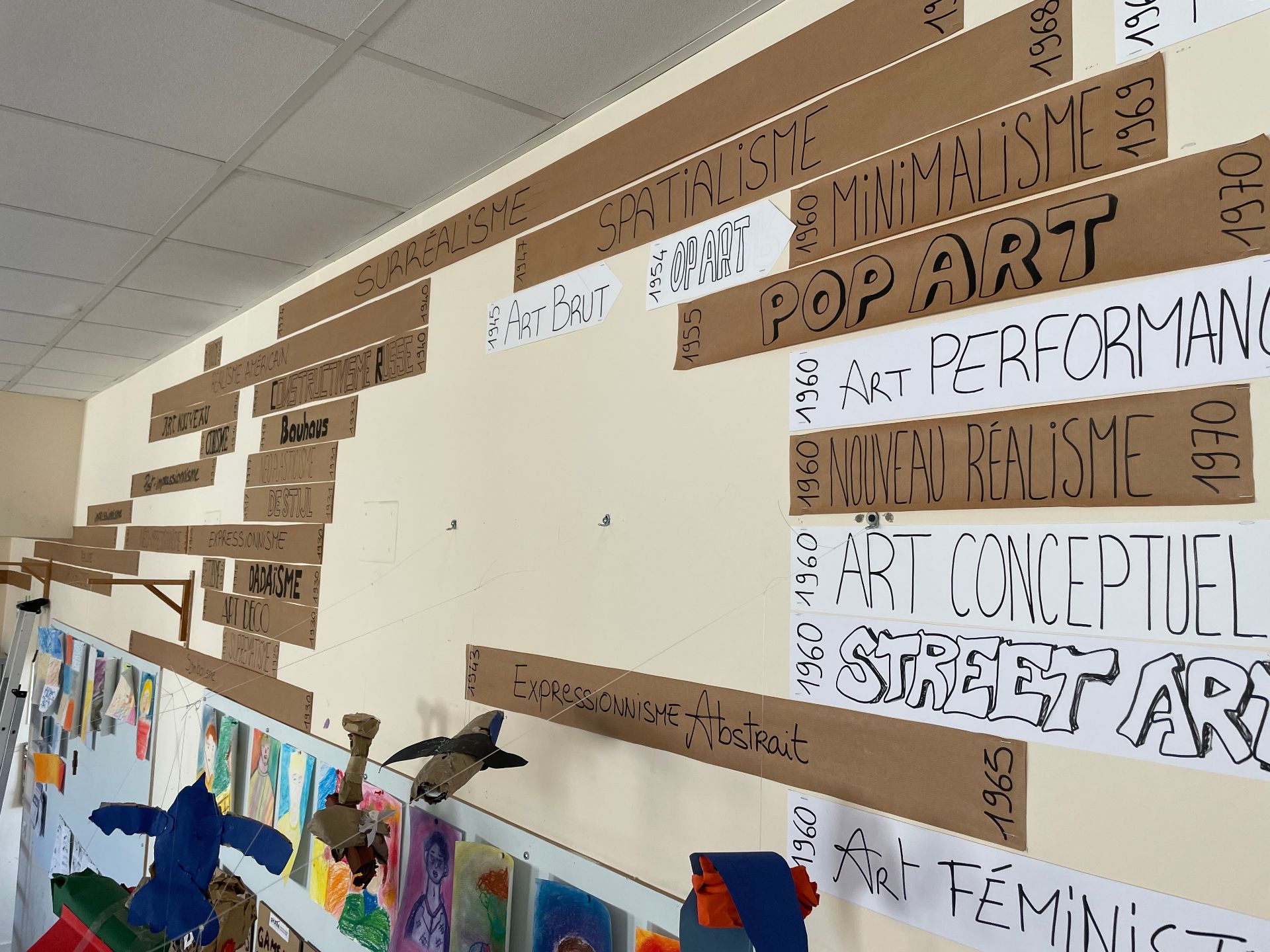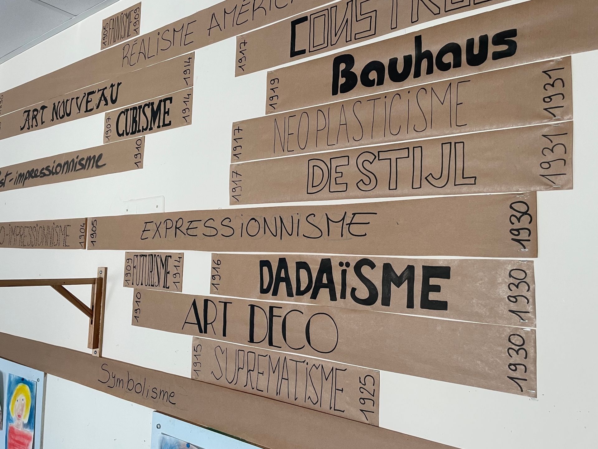 ⇒ En premier lieu, une grande frise à l'échelle 5 cm = 1 an est venue habiller les hauteurs des murs. Les élèves ont la possibilité de découvrir des noms de mouvements artistiques et de visualiser leur durée dans le temps, tout en comprenant que les absences ou les trous peuvent être liés aux grands changements ou guerres. Ils prennent également conscience de la quantité de mouvements qui peuvent coexister simultanément, surtout du 19ᵉ au 20ᵉ siècle.