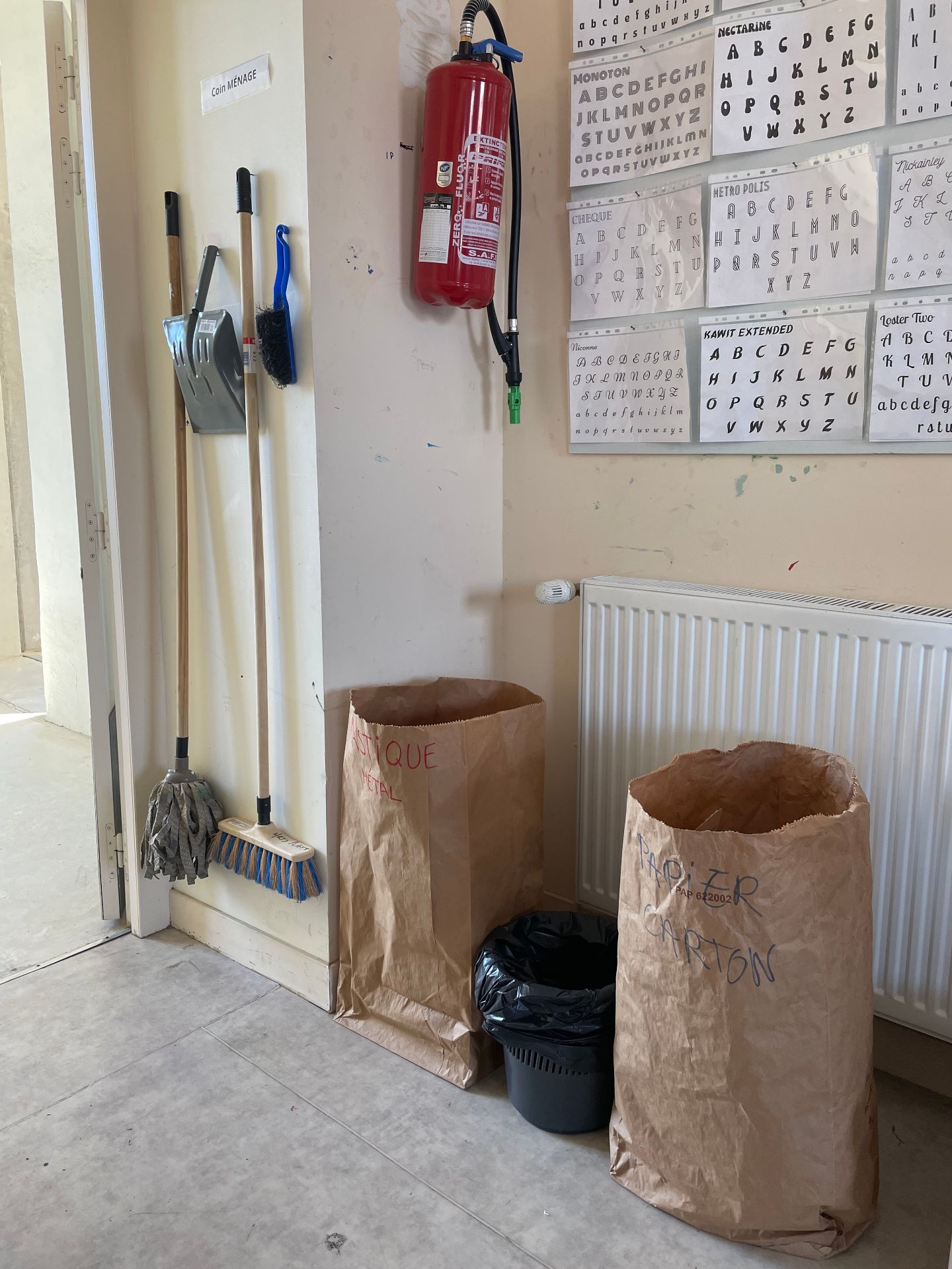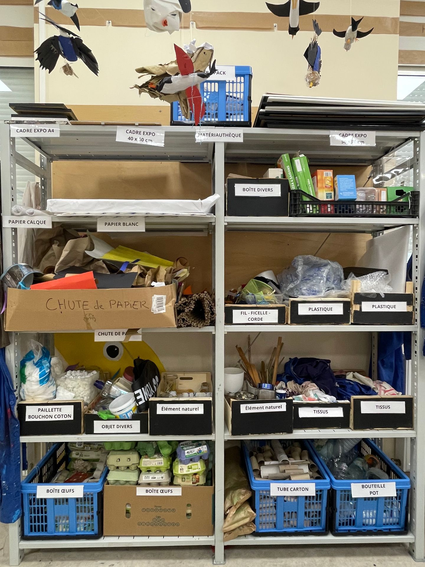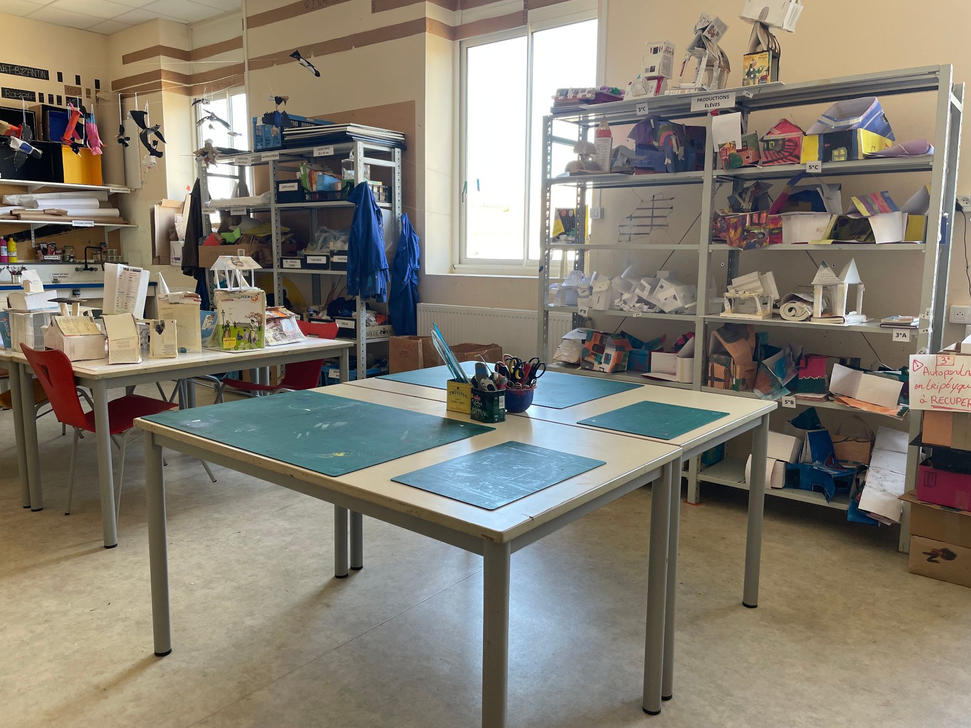 Pour l'acquisition de ces compétences, différents espaces se sont organisés en salle d'Arts plastiques. Par exemple, la construction d'une matériauthèque, remplie par la récupération de matière en interne au collège, par les professeurs et des élèves tout au long de l'année. Cela permet aux élèves d'avoir accès à des matériaux variés pour la réalisation de leurs projets.